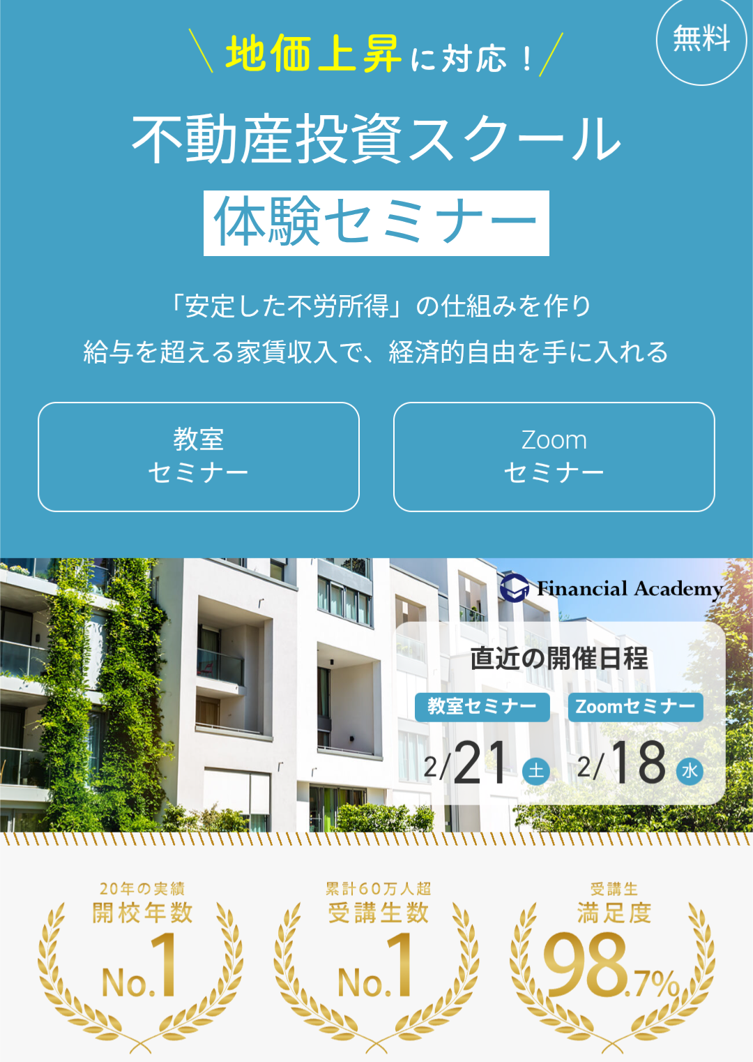ファイナンシャルアカデミーは、2002年に創立された独立系のマネースクールです。その中でも「不動産投資の学校」は、不動産の選び方、収支計算、融資、管理、税金に至るまでを体系的に学べる旗艦コースです。